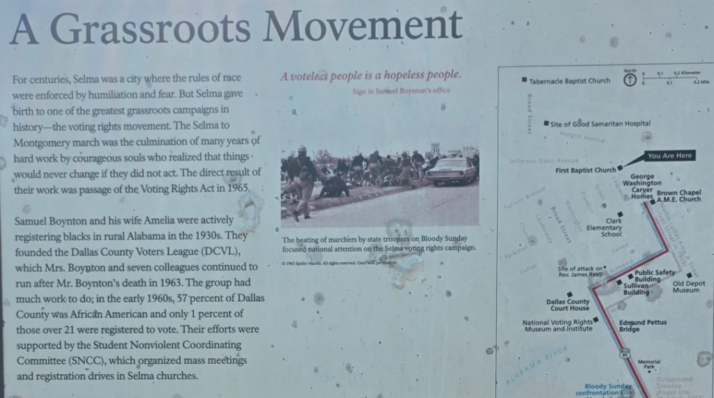 Edmund Pettus Bridge, crossing the Alabama River in Selma, Alabama, that was the site of what became known as “Bloody Sunday,” a landmark event in the history of the American civil rights movement. On that day, March 7, 1965, white law-enforcement officers violently dispersed protesters, the vast majority of whom were African American, as they crossed the bridge during the first attempt to initiate the Selma March.Martin Luther King speech at Brown Chapel, January 1965: When we get the right to vote, we will send to the statehouse not men who will stand in the doorways of universities to keep Negroes out, but men who will uphold the cause of justice. Give us the ballot.Memorial to Martin Luther KingFirst Baptist Church was the first church in Selma to host meetings and activities of the Dallas County Voters League, violating unconstitutional anti-mass meeting laws, where in 1965 it organized the Selma to Montgomery march.Monuments at Civil Rights Memorial Park