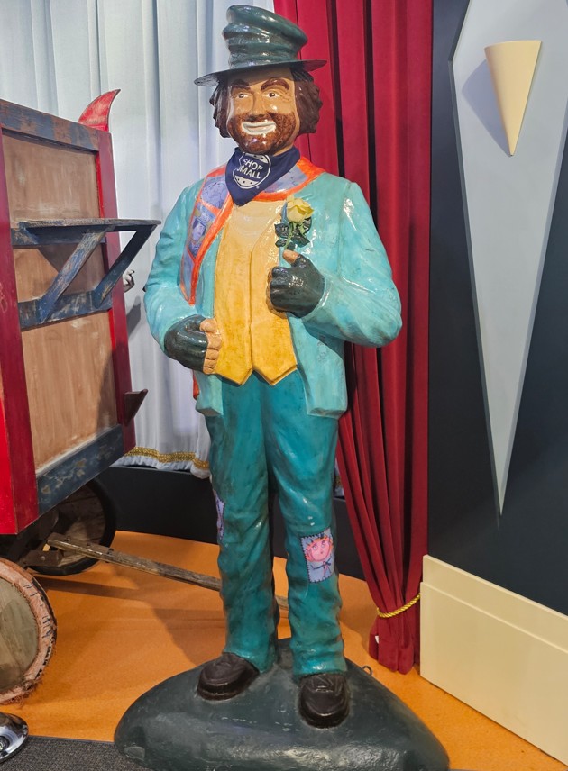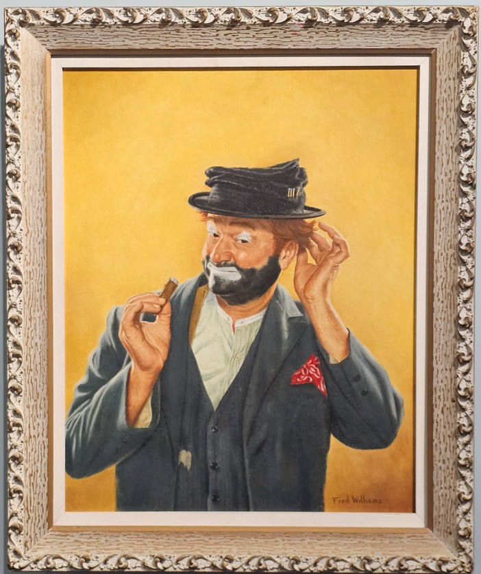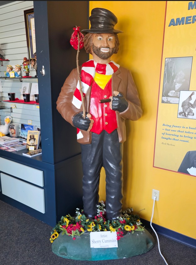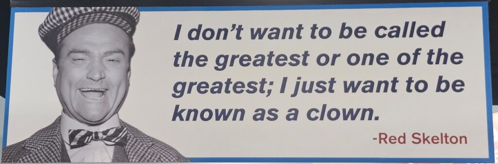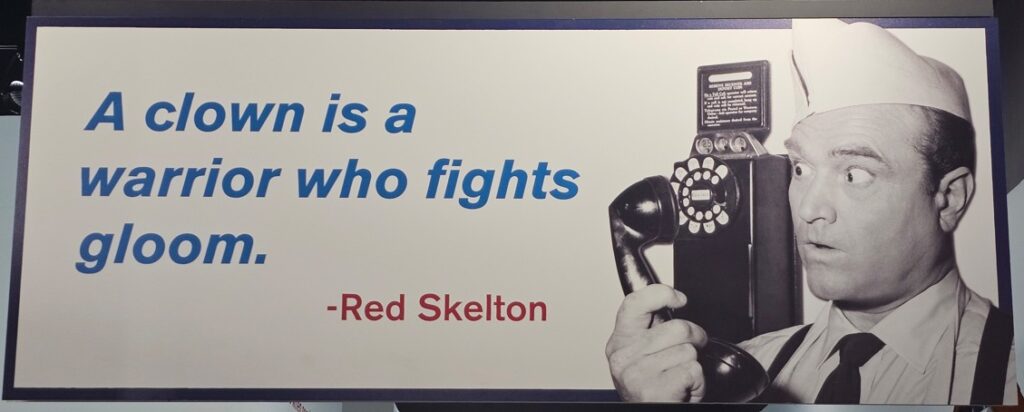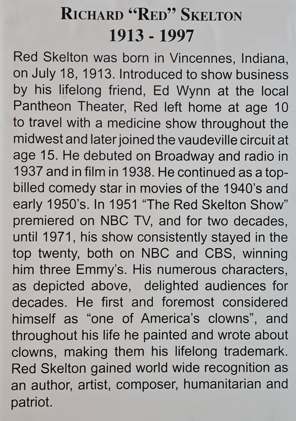 I grew up watching the Red Skelton Show. His comedy then is still funny today. Prior to his TV show, he was in movies.Skelton loved clowns.Skelton was a many of many characters and faces.Freddie the Freeloader costumeDeadeye Red costumeCauliflower McPugg costumeSan Fernando RedRed’s three Emmy Awards.Red was also an accomplished painter, primarily of clowns.Many faces of Red SkeltonRed Skelton mural in downtown VincennesRed Skelton’s birthplace, 1913.