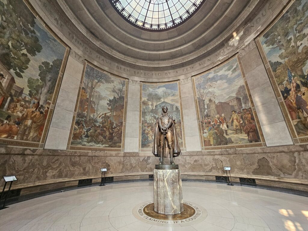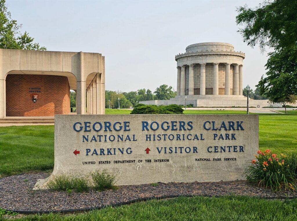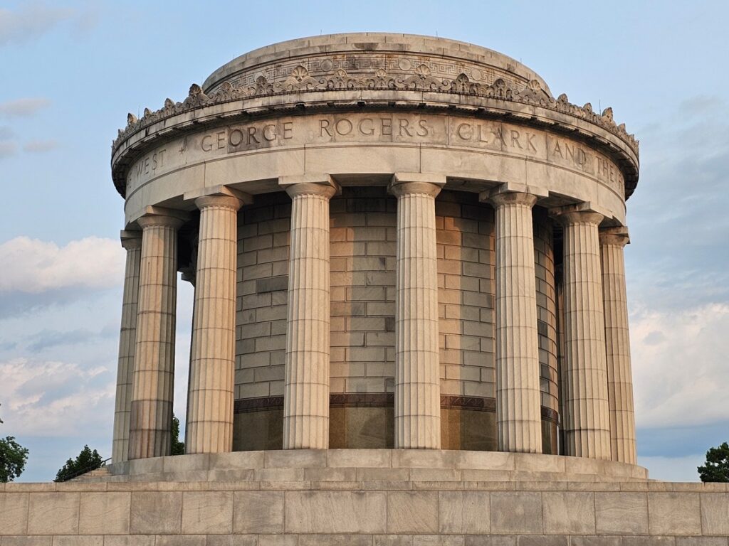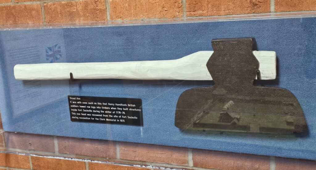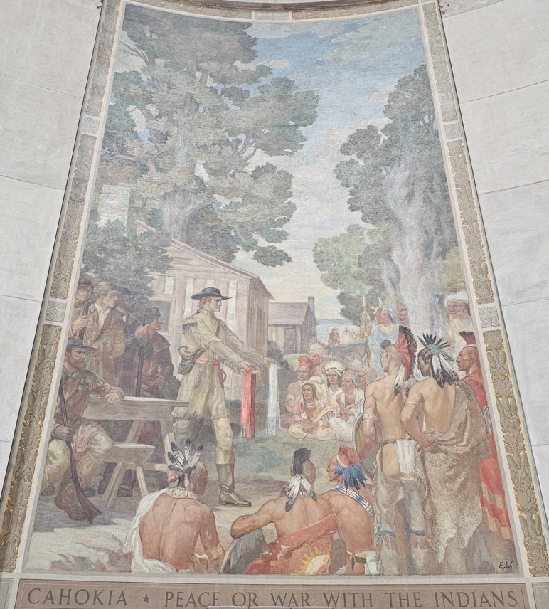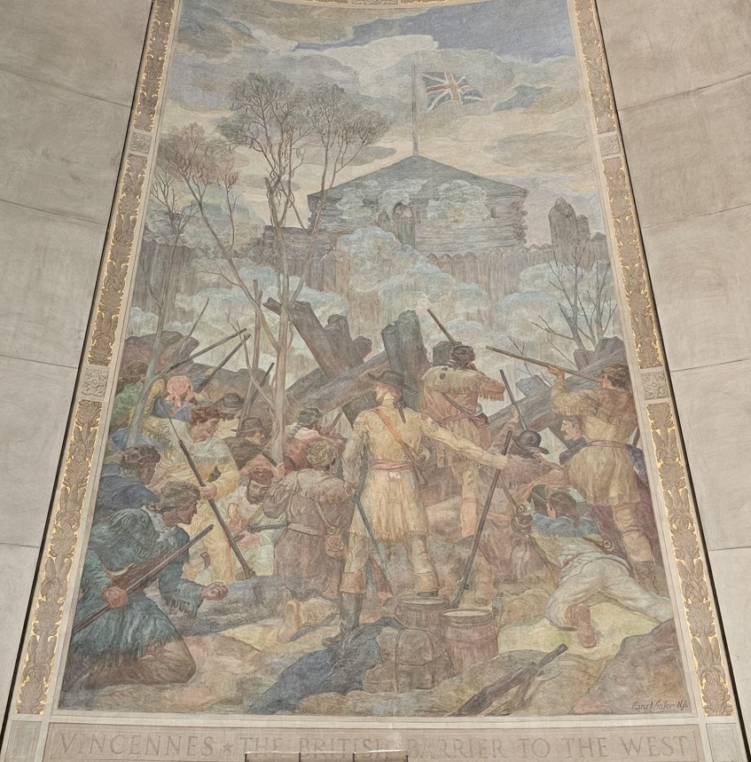 This monument memorializes George Rogers Clark’s daring victory over the British at Fort Sackville (current day Vincennes) in 1779, which was instrumental in winning the Revolutionary War, and opening the west to American expansion westward.The mall reminds you of the monuments in Washington DCThe Lincoln Memorial Bridge over the Wabash River reminds you of the Francis Scott Key Bridge in Washington DC.George Rogers Clark……and the Frontiersmen……of the American Revolution.The Conquest of the WestGeorge Rogers Clark statue in the center of the memorial.The rotunda.Panels chronicle the history of the area. This one depicts George Rogers Clark on a white horse leading settlers across the Allegheny Mountains.In 1778 Clark called for a conference at Cahokia to negotiate peace with the Native American tribes. He offered each tribe a choice of war or peace. Peace if they sided with the Americans in the Revolutionary War. Choosing the while belt meant they would side with the Americans, red for siding with the British. Most tribes chose to support the US, but some sided with Britain.In December 1778 British forces retook control of Fort Sackville from the French and Americans. Clark and his men executed a midwinter attack in February 1779 to retake the fort. They crossed 160 miles of frozen and eventually prairie over 19 days. The last 10 ,miles were completed without food, and sometimes water reached their necks. They retook Fort Sackville on February 25, 1779.While surrounding Fort Sackville, Clark intercepted some Native Americans who were British allies, and he executed them within view of the fort. The British thought Clark had large numbers, so they surrendered the fort after two days, with no losses on either side.The mural shows British Lt. Gov. Henry Hamilton to George Rogers Clark on February 25, 1779. This surrender represented more than just surrendering one fort. Clark’s victory changed the dynamic on the western frontier, disrupting the British military presence in the west, and confused the Native Americans about their loyalties. The victory also led thousands of American colonists in the east to move west of the Appalachians.This scene in Marietta, Ohio in 1788 depicts the Secretary of the Northwest Territory Winthrop Sargent reading the Northwest Ordinance, which eventually developed into Indiana, Ohio, Illinois, Michigan and Wisconsin.Here Captain Amos Stoddard stands at attention with Meriwether Lewis to his left at St. Louis. With George Rogers Clark’s brother William Clark, Lewis led the Corps of Discovery expedition across the country to the Pacific Ocean. St. Louis is considered the Gateway of the West.A cannon for the time period.This scene in the Visitor Center depicts the combatants in the area: American frontiersman, French habitant, Indian, and British soldier.British soldiers used a broad axe like this to hew raw logs into timbers to build structures inside Fort Sackville during the winter 1778-1779. This axe head was recovered from the site of Fort Sackville during excavation for the Clark Memorial in 1931.President Lyndon Johnson at this desk in 1966, established George Rogers Clark National Historical Park. About 50,000 people attended the signing.