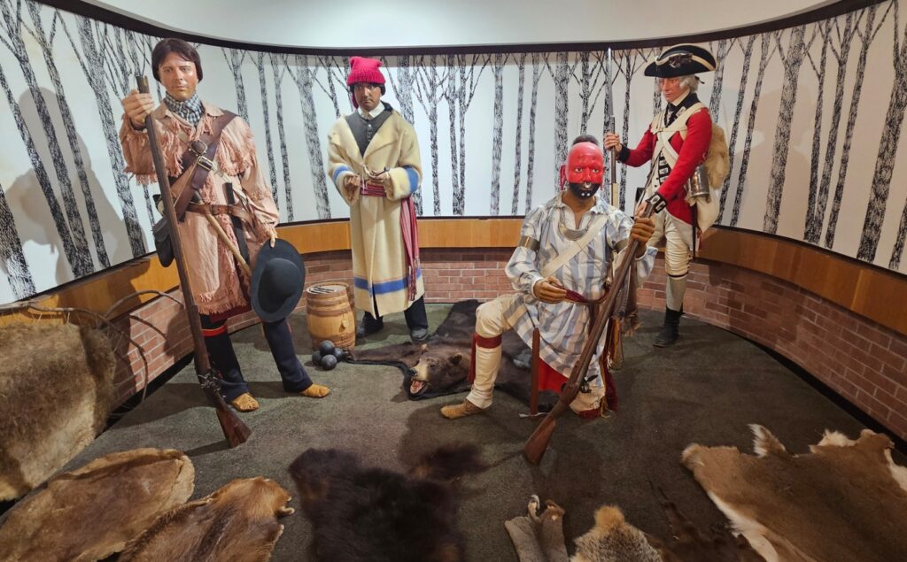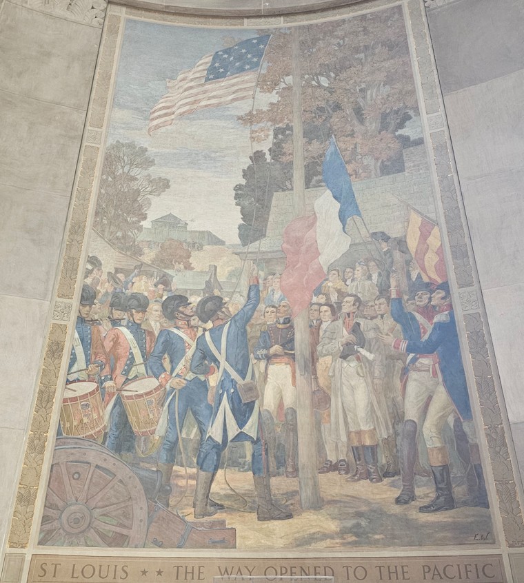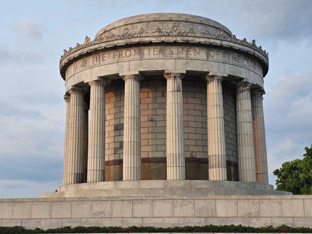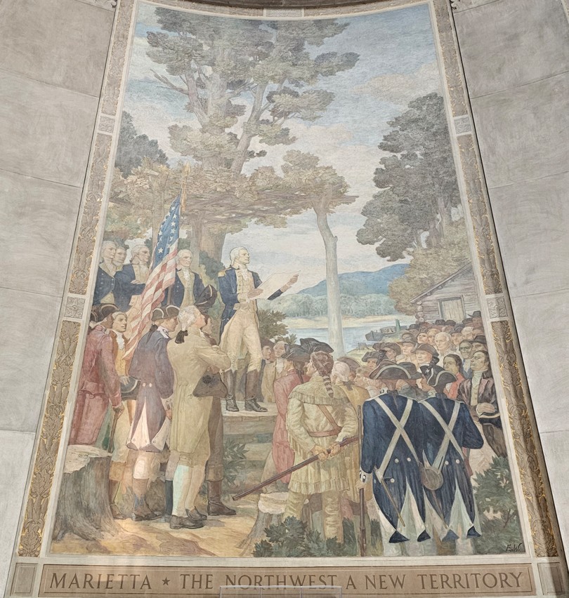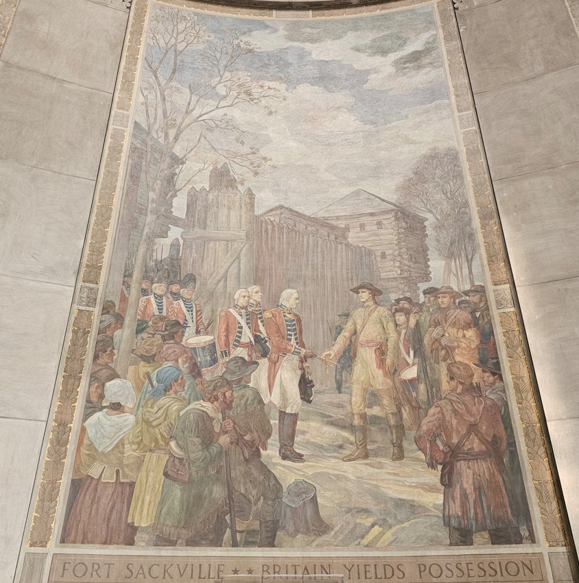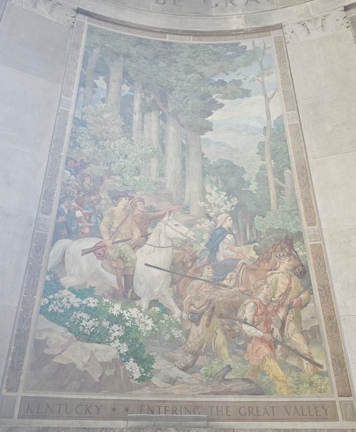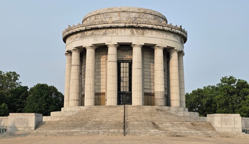 This monument memorializes George Rogers Clark’s daring victory over the British at Fort Sackville (current day Vincennes) in 1779, which was instrumental in winning the Revolutionary War, and opening the west to American expansion westward.The mall reminds you of the monuments in Washington DCThe Lincoln Memorial Bridge over the Wabash River reminds you of the Francis Scott Key Bridge in Washington DC.George Rogers Clark……and the Frontiersmen……of the American Revolution.The Conquest of the WestGeorge Rogers Clark statue in the center of the memorial.The rotunda.Panels chronicle the history of the area. This one depicts George Rogers Clark on a white horse leading settlers across the Allegheny Mountains.In 1778 Clark called for a conference at Cahokia to negotiate peace with the Native American tribes. He offered each tribe a choice of war or peace. Peace if they sided with the Americans in the Revolutionary War. Choosing the while belt meant they would side with the Americans, red for siding with the British. Most tribes chose to support the US, but some sided with Britain.In December 1778 British forces retook control of Fort Sackville from the French and Americans. Clark and his men executed a midwinter attack in February 1779 to retake the fort. They crossed 160 miles of frozen and eventually prairie over 19 days. The last 10 ,miles were completed without food, and sometimes water reached their necks. They retook Fort Sackville on February 25, 1779.While surrounding Fort Sackville, Clark intercepted some Native Americans who were British allies, and he executed them within view of the fort. The British thought Clark had large numbers, so they surrendered the fort after two days, with no losses on either side.The mural shows British Lt. Gov. Henry Hamilton to George Rogers Clark on February 25, 1779. This surrender represented more than just surrendering one fort. Clark’s victory changed the dynamic on the western frontier, disrupting the British military presence in the west, and confused the Native Americans about their loyalties. The victory also led thousands of American colonists in the east to move west of the Appalachians.This scene in Marietta, Ohio in 1788 depicts the Secretary of the Northwest Territory Winthrop Sargent reading the Northwest Ordinance, which eventually developed into Indiana, Ohio, Illinois, Michigan and Wisconsin.Here Captain Amos Stoddard stands at attention with Meriwether Lewis to his left at St. Louis. With George Rogers Clark’s brother William Clark, Lewis led the Corps of Discovery expedition across the country to the Pacific Ocean. St. Louis is considered the Gateway of the West.A cannon for the time period.This scene in the Visitor Center depicts the combatants in the area: American frontiersman, French habitant, Indian, and British soldier.British soldiers used a broad axe like this to hew raw logs into timbers to build structures inside Fort Sackville during the winter 1778-1779. This axe head was recovered from the site of Fort Sackville during excavation for the Clark Memorial in 1931.President Lyndon Johnson at this desk in 1966, established George Rogers Clark National Historical Park. About 50,000 people attended the signing.