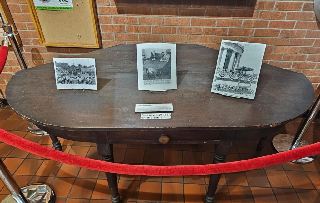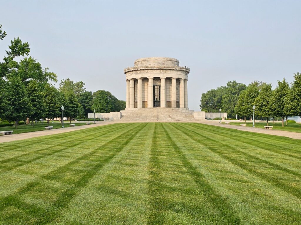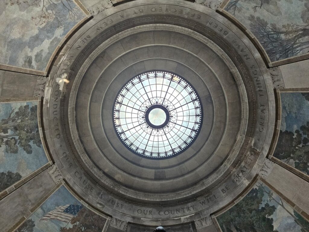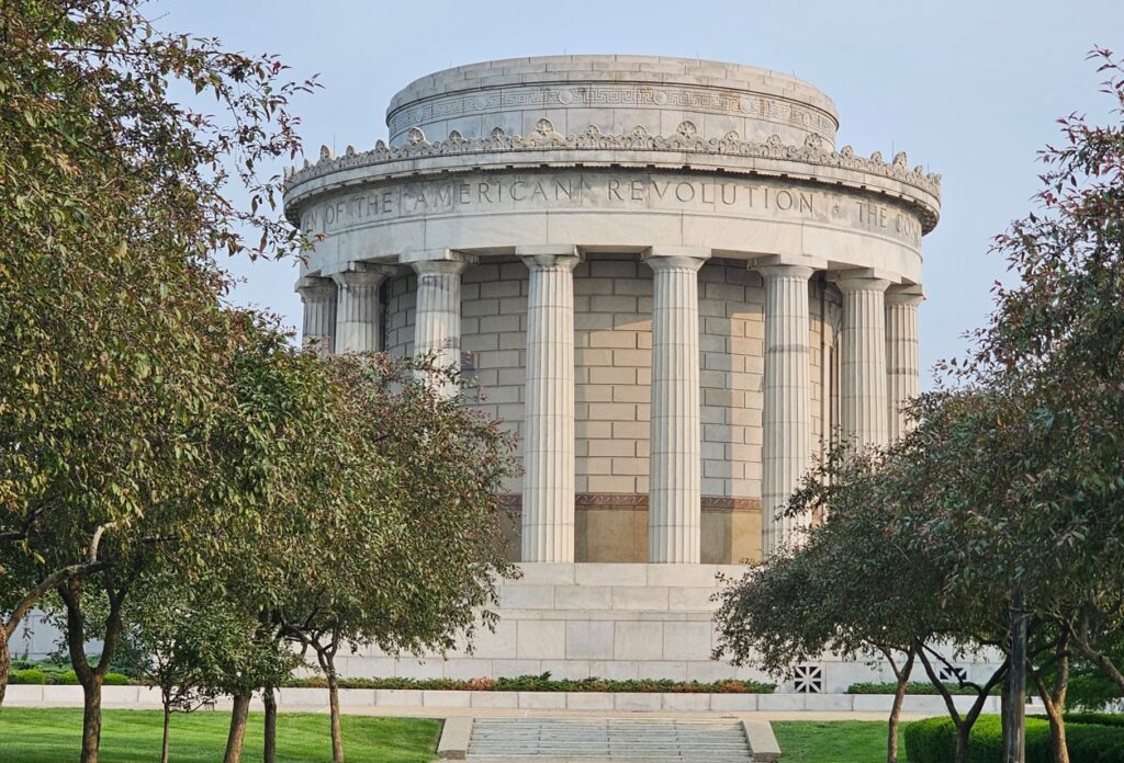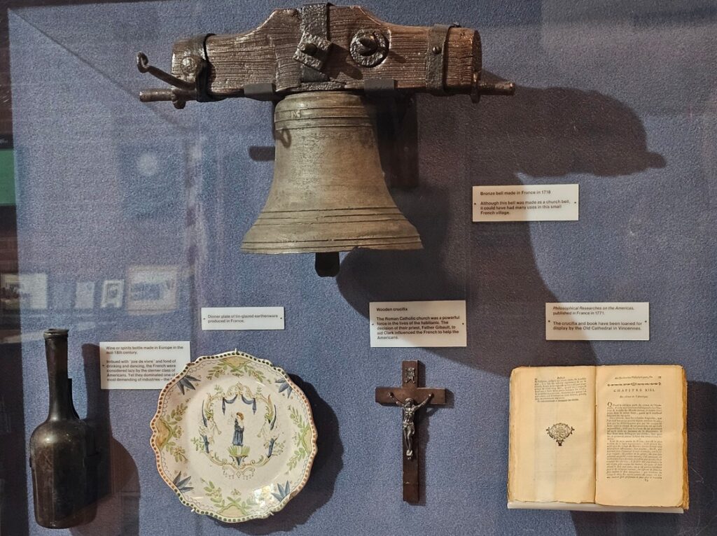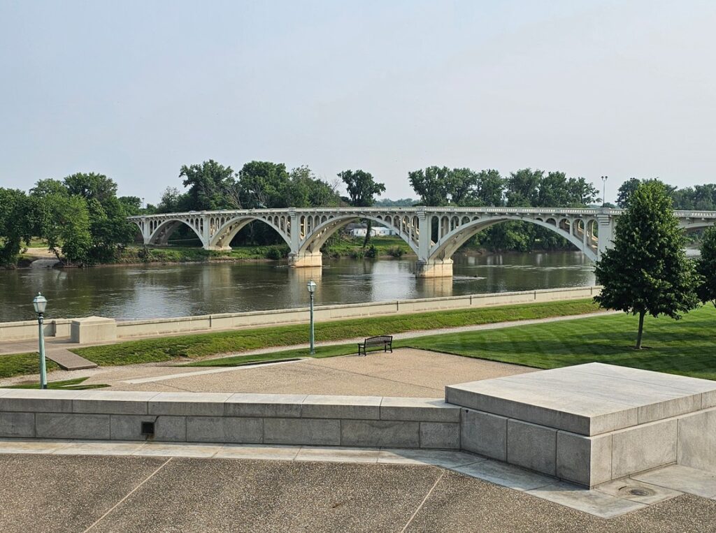 This monument memorializes George Rogers Clark’s daring victory over the British at Fort Sackville (current day Vincennes) in 1779, which was instrumental in winning the Revolutionary War, and opening the west to American expansion westward.The mall reminds you of the monuments in Washington DCThe Lincoln Memorial Bridge over the Wabash River reminds you of the Francis Scott Key Bridge in Washington DC.George Rogers Clark……and the Frontiersmen……of the American Revolution.The Conquest of the WestGeorge Rogers Clark statue in the center of the memorial.The rotunda.Panels chronicle the history of the area. This one depicts George Rogers Clark on a white horse leading settlers across the Allegheny Mountains.In 1778 Clark called for a conference at Cahokia to negotiate peace with the Native American tribes. He offered each tribe a choice of war or peace. Peace if they sided with the Americans in the Revolutionary War. Choosing the while belt meant they would side with the Americans, red for siding with the British. Most tribes chose to support the US, but some sided with Britain.In December 1778 British forces retook control of Fort Sackville from the French and Americans. Clark and his men executed a midwinter attack in February 1779 to retake the fort. They crossed 160 miles of frozen and eventually prairie over 19 days. The last 10 ,miles were completed without food, and sometimes water reached their necks. They retook Fort Sackville on February 25, 1779.While surrounding Fort Sackville, Clark intercepted some Native Americans who were British allies, and he executed them within view of the fort. The British thought Clark had large numbers, so they surrendered the fort after two days, with no losses on either side.The mural shows British Lt. Gov. Henry Hamilton to George Rogers Clark on February 25, 1779. This surrender represented more than just surrendering one fort. Clark’s victory changed the dynamic on the western frontier, disrupting the British military presence in the west, and confused the Native Americans about their loyalties. The victory also led thousands of American colonists in the east to move west of the Appalachians.This scene in Marietta, Ohio in 1788 depicts the Secretary of the Northwest Territory Winthrop Sargent reading the Northwest Ordinance, which eventually developed into Indiana, Ohio, Illinois, Michigan and Wisconsin.Here Captain Amos Stoddard stands at attention with Meriwether Lewis to his left at St. Louis. With George Rogers Clark’s brother William Clark, Lewis led the Corps of Discovery expedition across the country to the Pacific Ocean. St. Louis is considered the Gateway of the West.A cannon for the time period.This scene in the Visitor Center depicts the combatants in the area: American frontiersman, French habitant, Indian, and British soldier.British soldiers used a broad axe like this to hew raw logs into timbers to build structures inside Fort Sackville during the winter 1778-1779. This axe head was recovered from the site of Fort Sackville during excavation for the Clark Memorial in 1931.President Lyndon Johnson at this desk in 1966, established George Rogers Clark National Historical Park. About 50,000 people attended the signing.