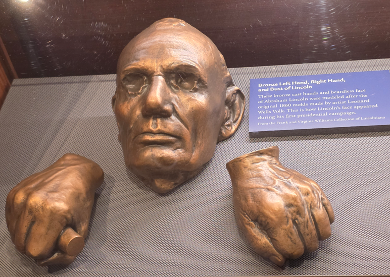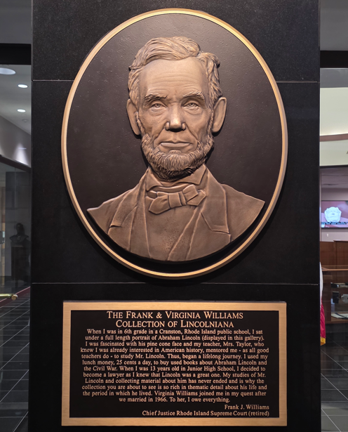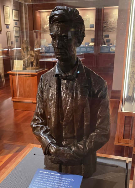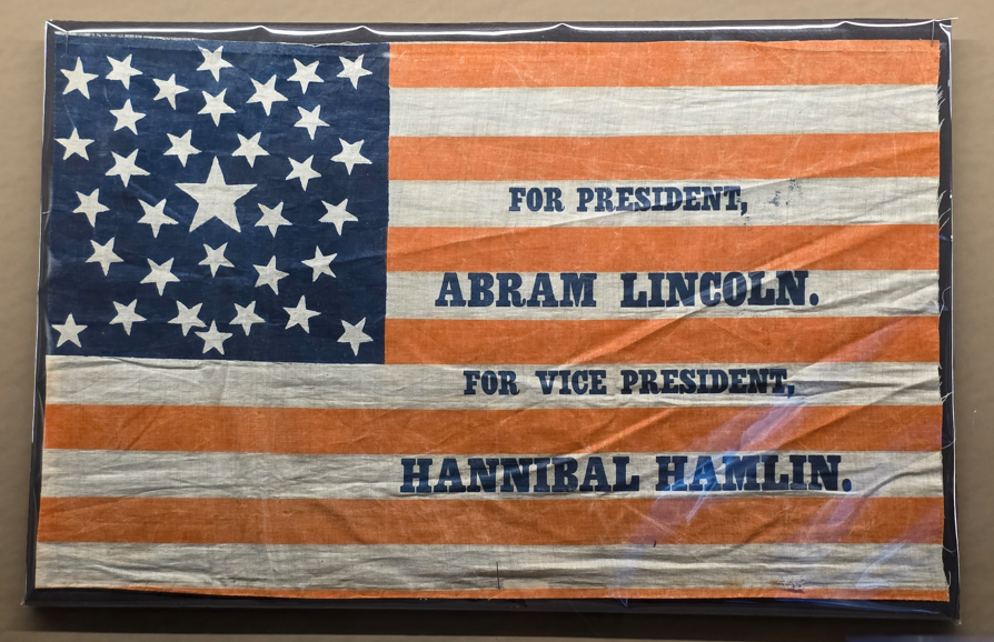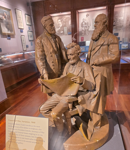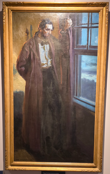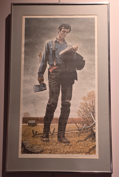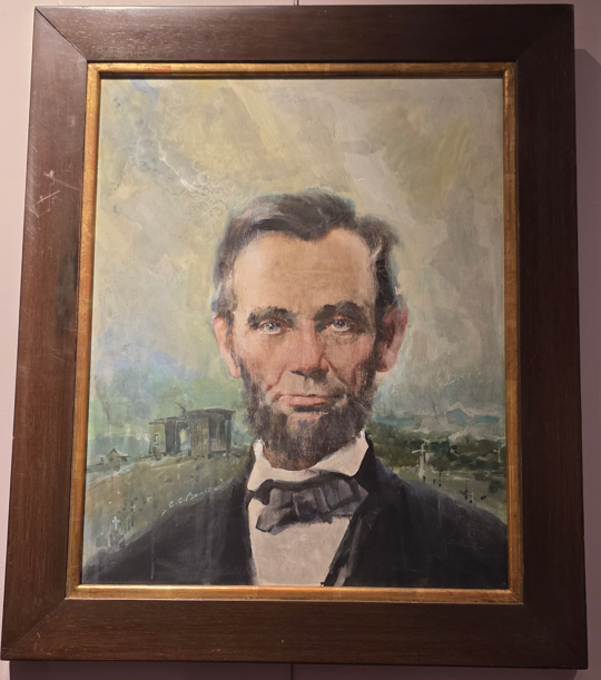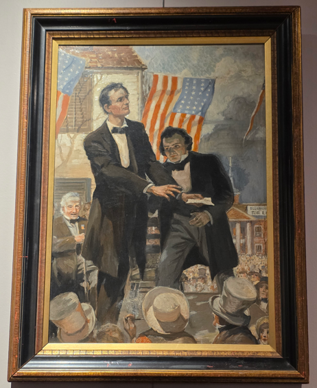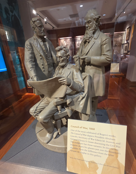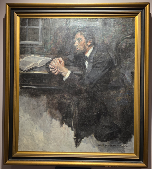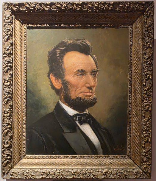 Council of War, 1868, depicting General Grant, President Lincoln and Secretary of War Stanton.Council of War variation, 1868Bronze bust of Lincoln without the beardLincoln-Douglas Debate, by John D. WhitingYoung Lincoln, by Norman RockwellLincoln portrait by C.C. BeallLincoln in Prayer, by James Montgomery FlaggLincoln at Window, by James Montgomery FlaggLincoln portrait by F.C. CourterOriginal 1860 campaign flag