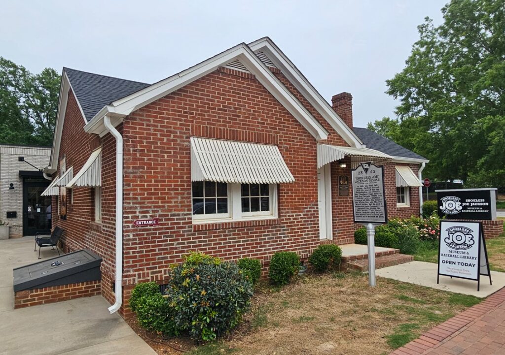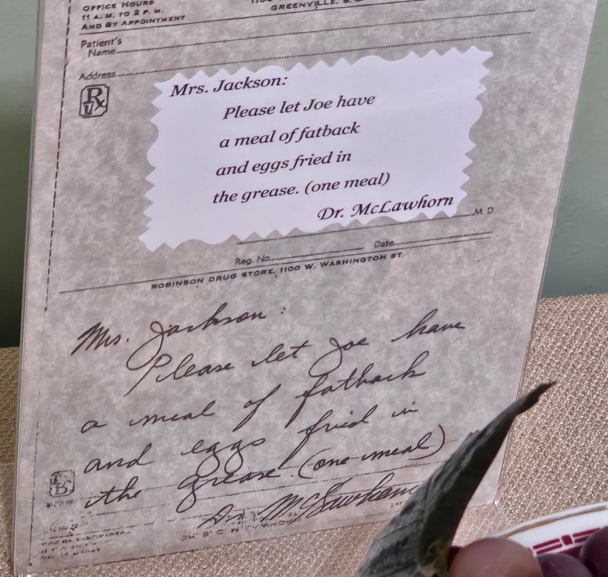 Joe Jackson, a native of Greenville, is widely considered one of the greatest hitters in baseball history. He was banned from baseball after the 1919 Black Sox scandal where several White Sox players were found guilty of taking bribes to throw the series. Jackson was never proven to throw a game.Joe Jackson’s home in Greenville. It is now a museum with memorabilia from Jackson’s life.Jackson’s living room.Joe and his wife KatieJackson’s kitchenDoctor’s “prescription” for Katie to fix breakfast “in grease”.