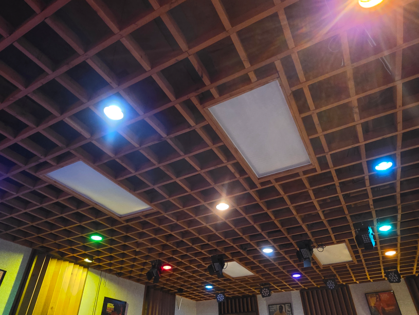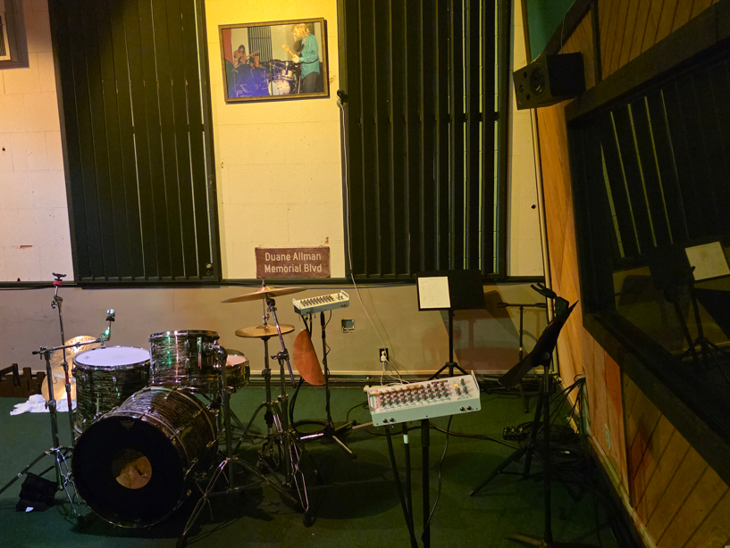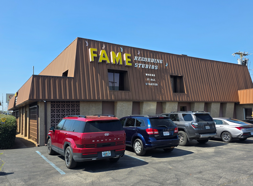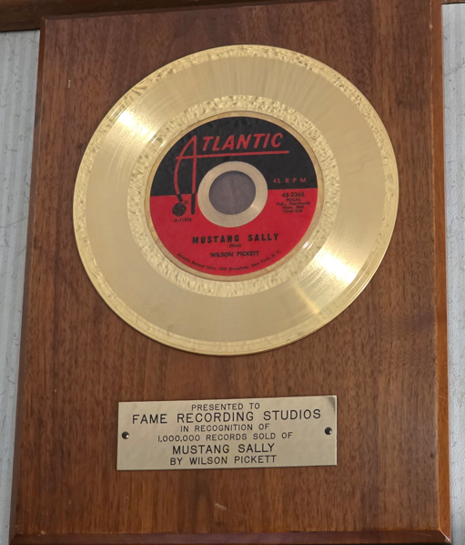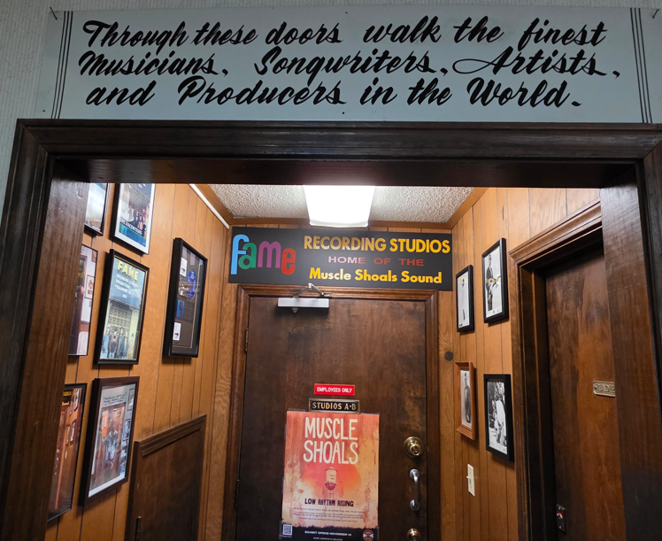 This FAME (Florence Alabama Music Enterprises) Recording Studios, which is still active recording top artists. They do tours every day, even when there is active recording going on, but no one was recording when we were there.One of the early stars to record at FAME. His hit Mustang Sally sold over 1 million records.Montage of some of the top stars that have recorded at FAME Studios.The door to the studiosStudio AStudio A ceiling for controlling soundComical notice on the key board. This is for serious musicians.Sound booth for the singers in Studio A.Studio B. Notice the louvered panels and the slanted wall, all for sound control/Sound booth for the singers in Studio B.Audio equipmentStudio B control room.