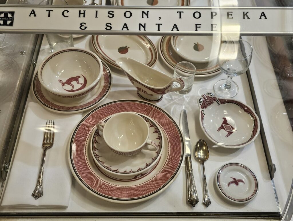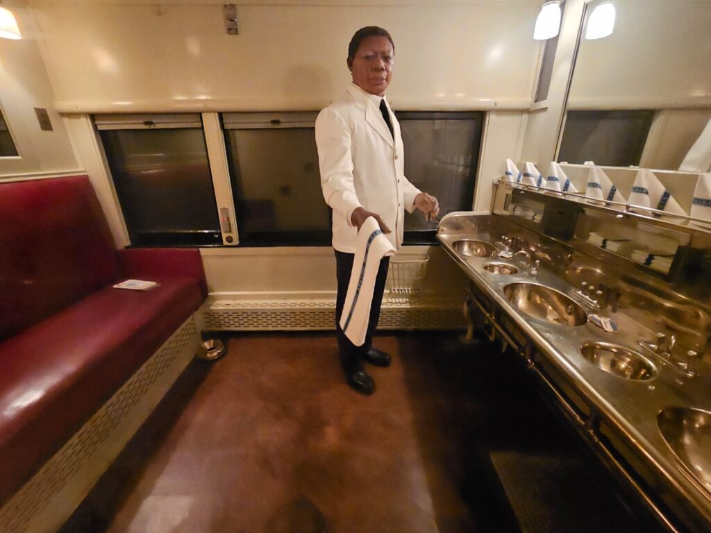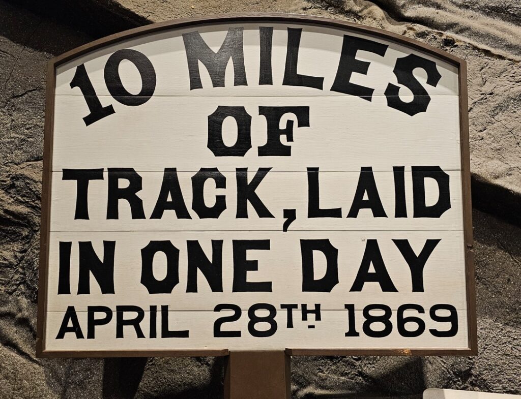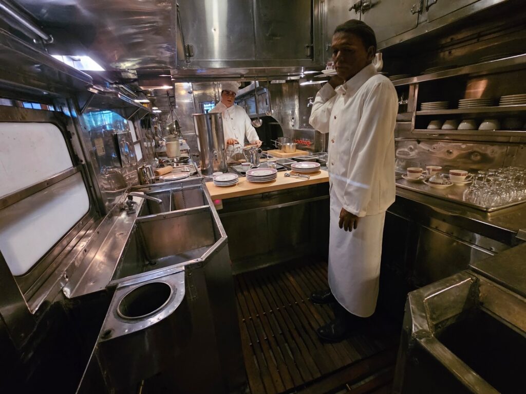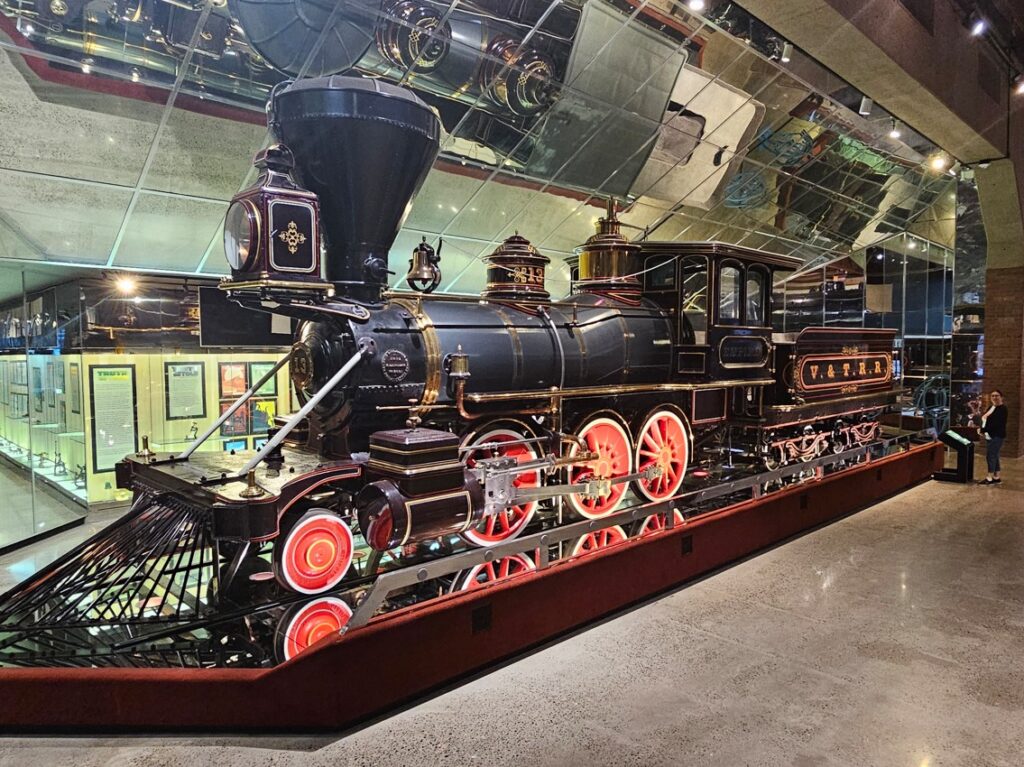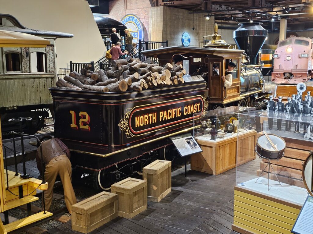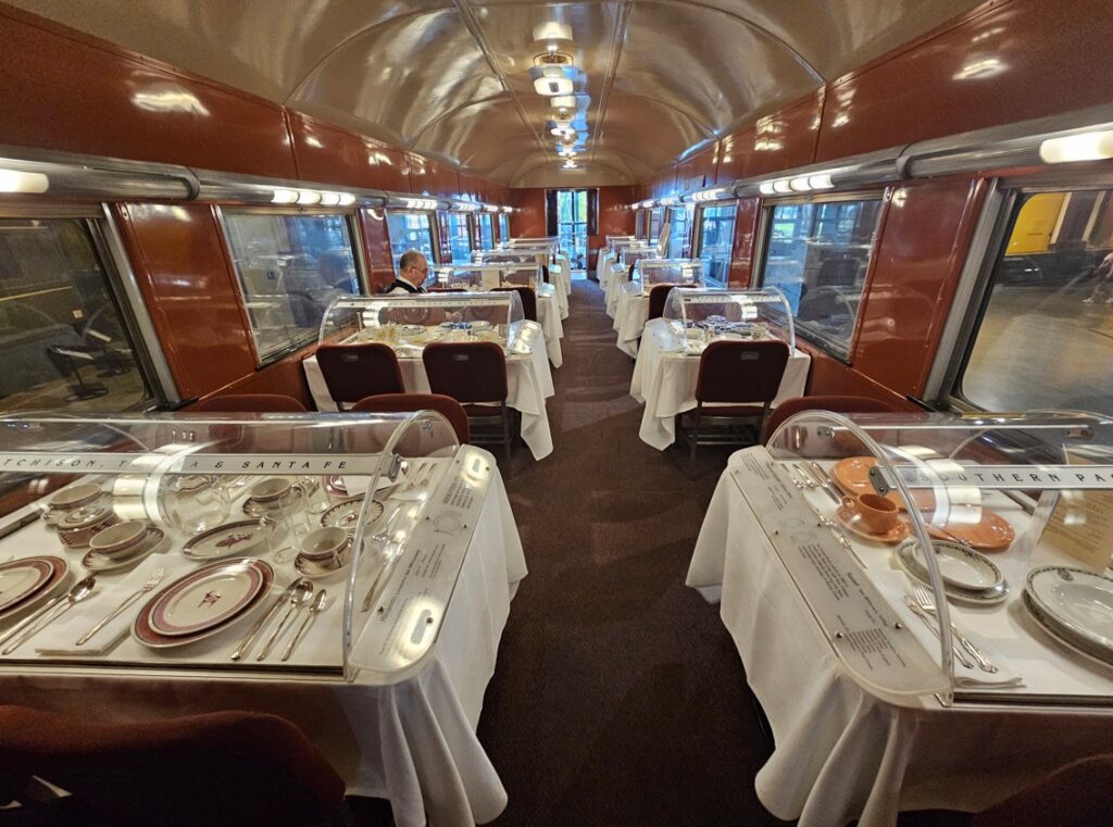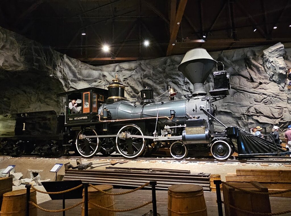 This is a pretty cool museum in Sacramento that exhibits railroad history in California. Virginia & Truckee Railroad Locomotive No. 13 “Empire” served as a freight engine for more than 40 years. Engine crews considered 13 an unlucky number so the company changed to 15.The Forgotten Railroad Workers Memorial Monument. Chinese artist Xuejun Yang created this monument in 2019, honoring the Chinese workers who played a heroic and important role building the Transcontinental Railroad. Between 1865 and 1869 Central Pacific Railroad employed more than 12,000 Chinese workers to build the western portion on the railroad. They cleared land, put down roadbed, shoveled snow, blasted tunnels through granite and laid track.Great Northern Railway Post Office Car No. 42 operated as a complete post office between Chicago IL and Tacoma WA. Inside the moving car, armed postal clerks sorted mail and the train moved along at up to 80 mph.Inside the mail car.My grandfather worked for a time in the 1940s and 1950s on a mail car between Washington DC and Jacksonville FL.Virginia & Truckee No. 18 “Dayton”.Atchison, Topeka & Santa Fe Dining Car No. 1474 “Cochiti” was built for Santa Fe’s first streamlined stainless steel train, the Los Angeles to Chicago Super Chief.Attentive waiters served meals on distinctive china. Railroad companies each had their own special designs.Fine dining on the rails!AT&SF railroad chins pattern.New York CentralComfortable seatingSleeping berthsProduce car.Baggage car (The people are real, not mannequins!)This scene interprets the building of the Transcontinental Railroad 1865-1869. A really well done display.Blasting through granite.Surveyor.Surveying and building equipment.A proud achievement.