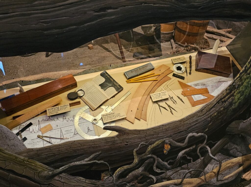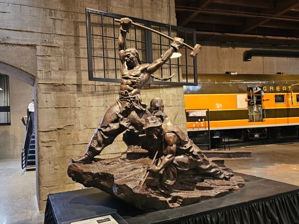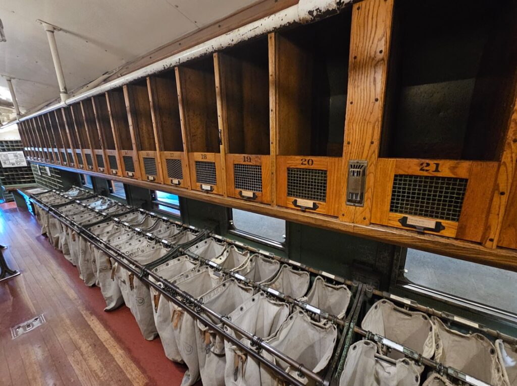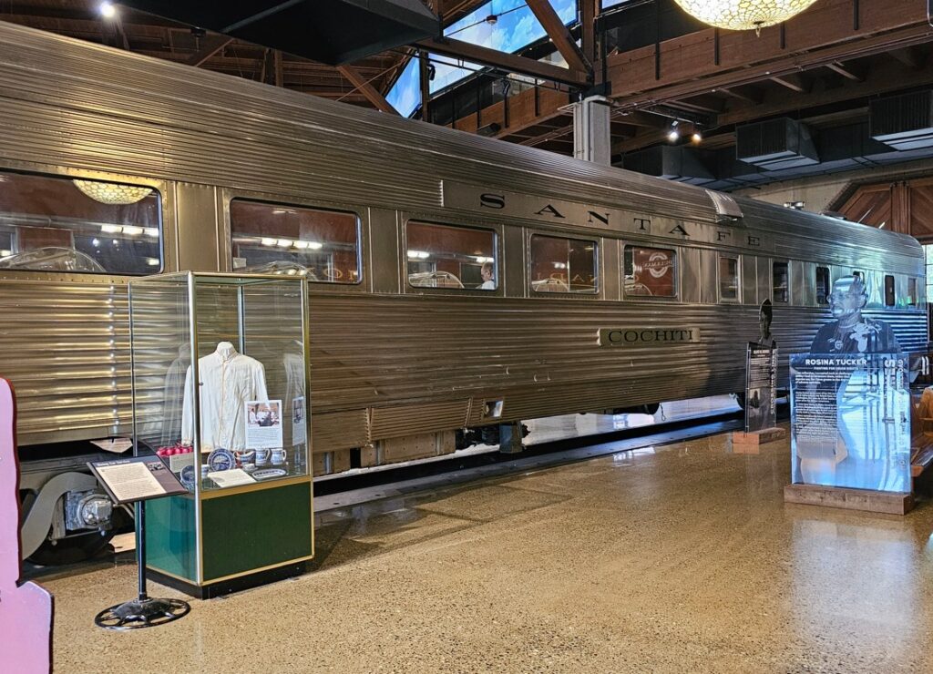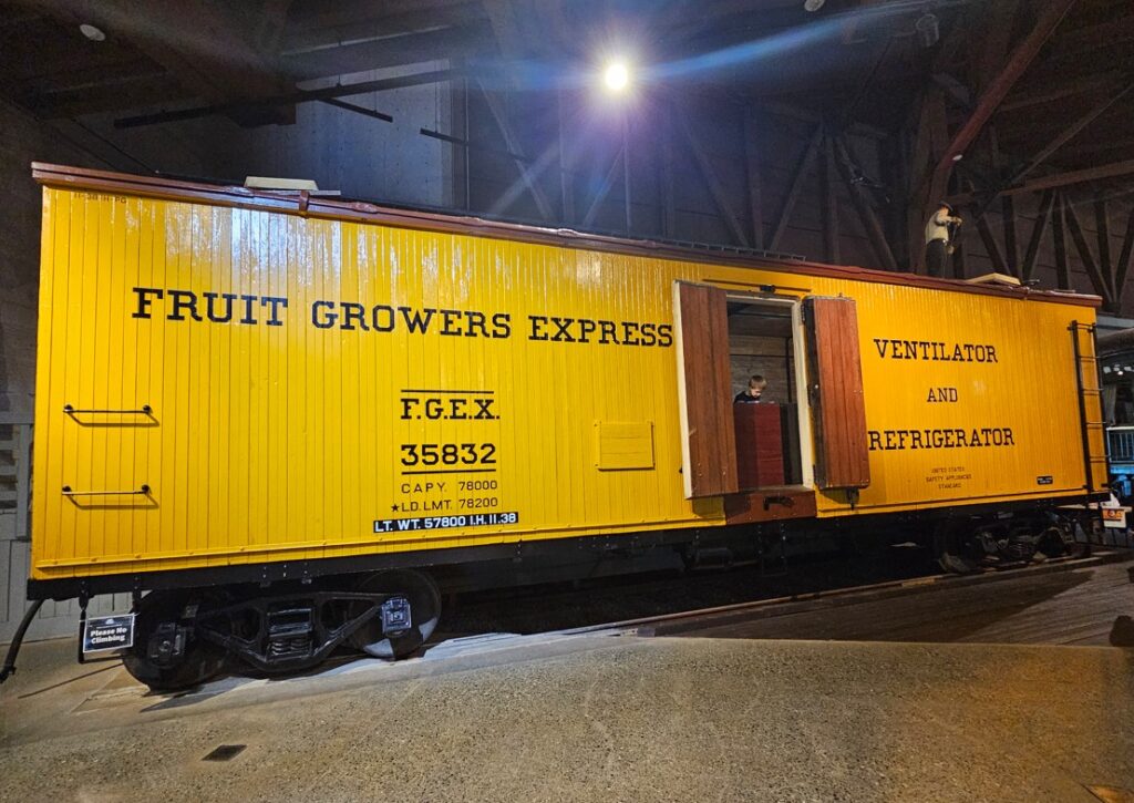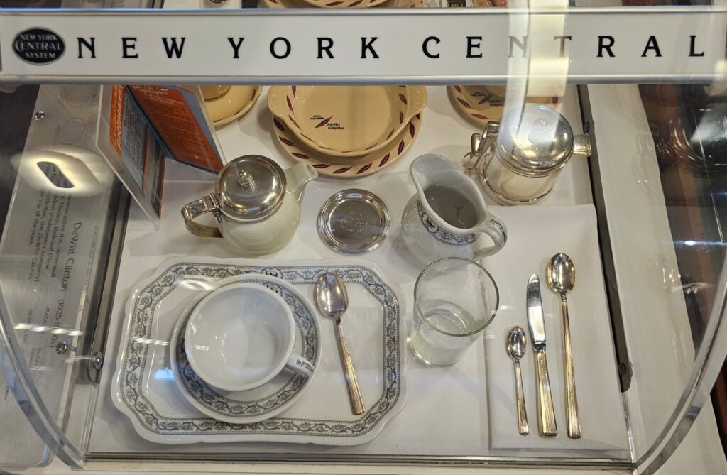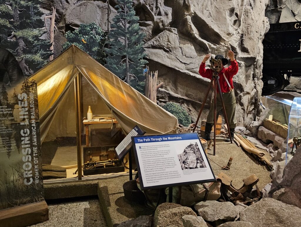 This is a pretty cool museum in Sacramento that exhibits railroad history in California. Virginia & Truckee Railroad Locomotive No. 13 “Empire” served as a freight engine for more than 40 years. Engine crews considered 13 an unlucky number so the company changed to 15.The Forgotten Railroad Workers Memorial Monument. Chinese artist Xuejun Yang created this monument in 2019, honoring the Chinese workers who played a heroic and important role building the Transcontinental Railroad. Between 1865 and 1869 Central Pacific Railroad employed more than 12,000 Chinese workers to build the western portion on the railroad. They cleared land, put down roadbed, shoveled snow, blasted tunnels through granite and laid track.Great Northern Railway Post Office Car No. 42 operated as a complete post office between Chicago IL and Tacoma WA. Inside the moving car, armed postal clerks sorted mail and the train moved along at up to 80 mph.Inside the mail car.My grandfather worked for a time in the 1940s and 1950s on a mail car between Washington DC and Jacksonville FL.Virginia & Truckee No. 18 “Dayton”.Atchison, Topeka & Santa Fe Dining Car No. 1474 “Cochiti” was built for Santa Fe’s first streamlined stainless steel train, the Los Angeles to Chicago Super Chief.Attentive waiters served meals on distinctive china. Railroad companies each had their own special designs.Fine dining on the rails!AT&SF railroad chins pattern.New York CentralComfortable seatingSleeping berthsProduce car.Baggage car (The people are real, not mannequins!)This scene interprets the building of the Transcontinental Railroad 1865-1869. A really well done display.Blasting through granite.Surveyor.Surveying and building equipment.A proud achievement.