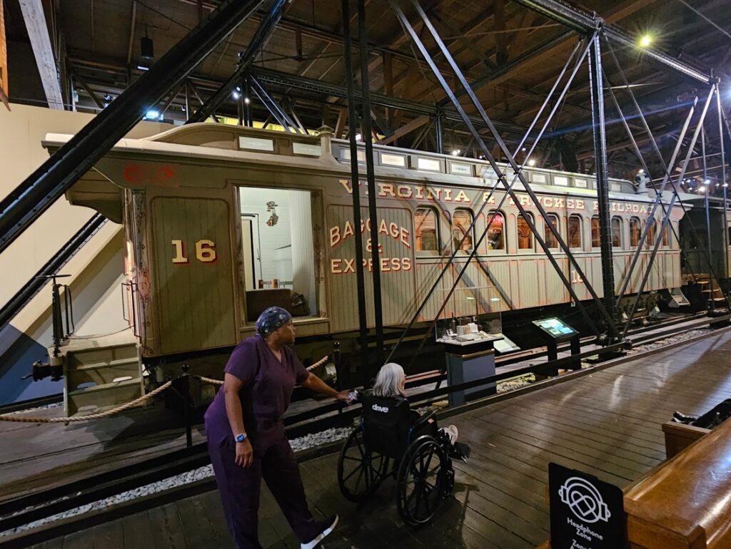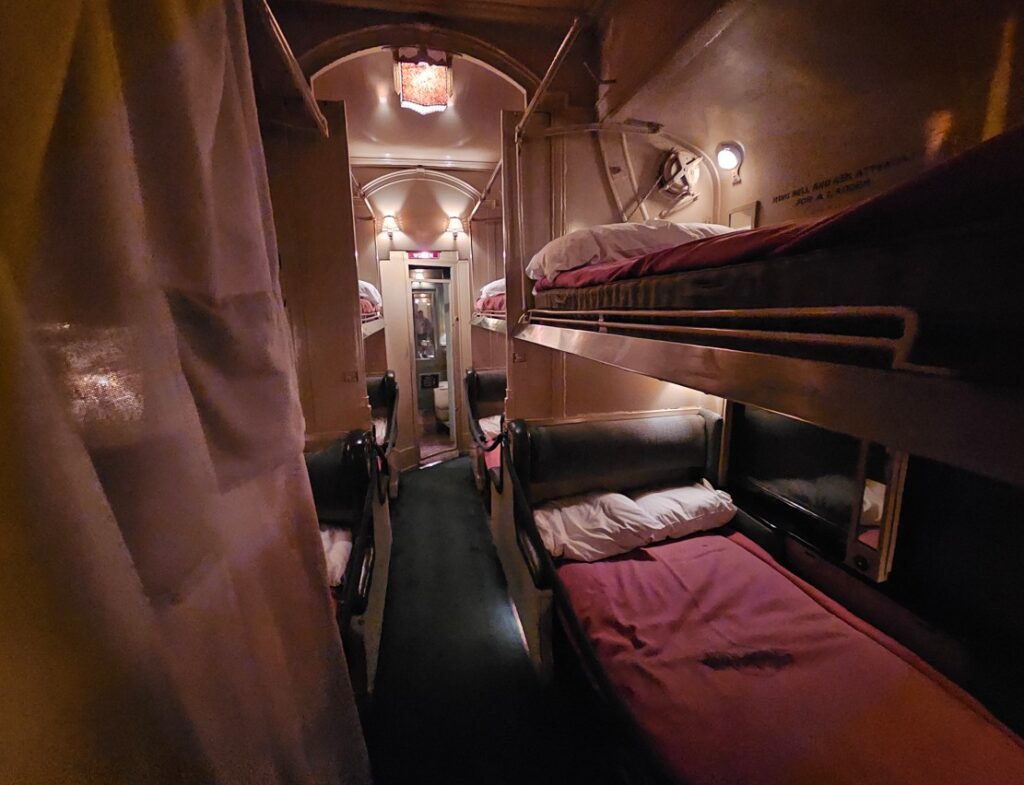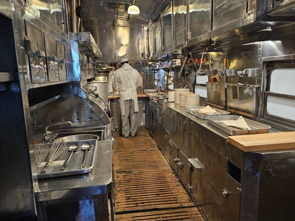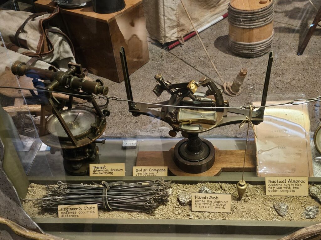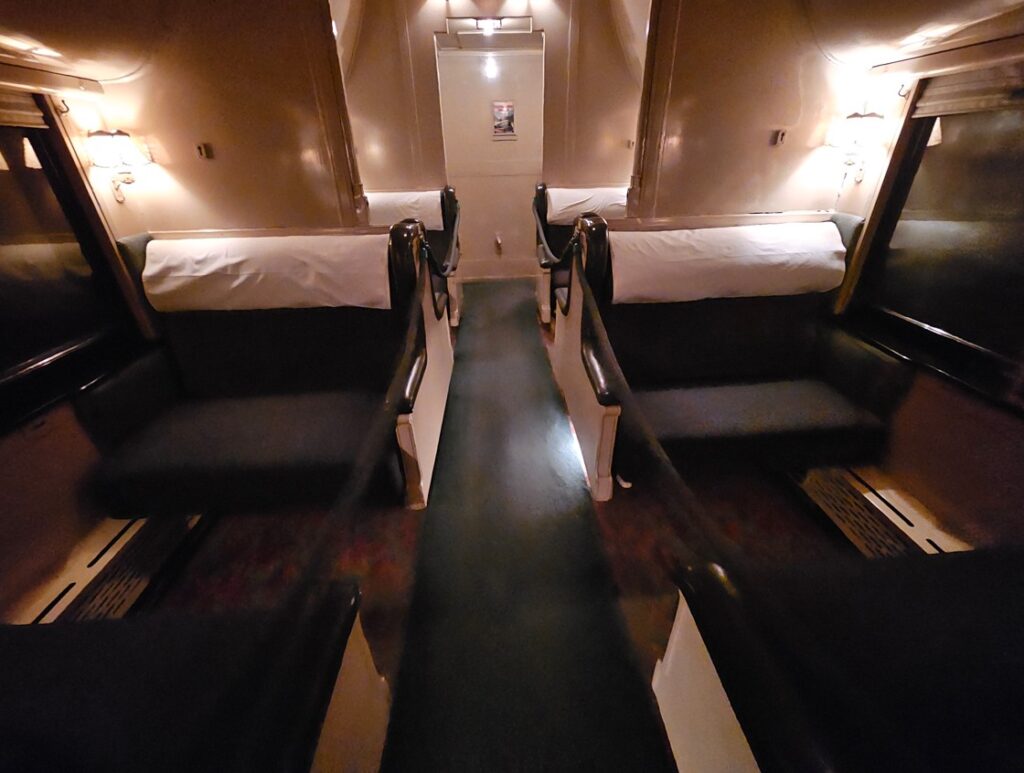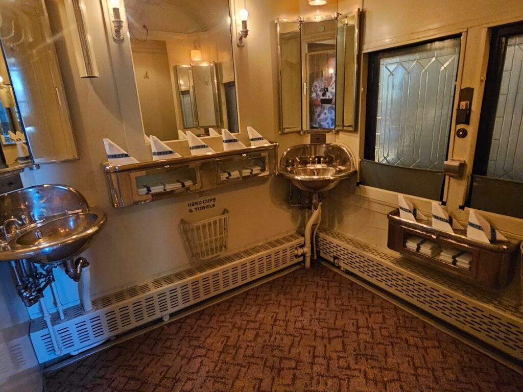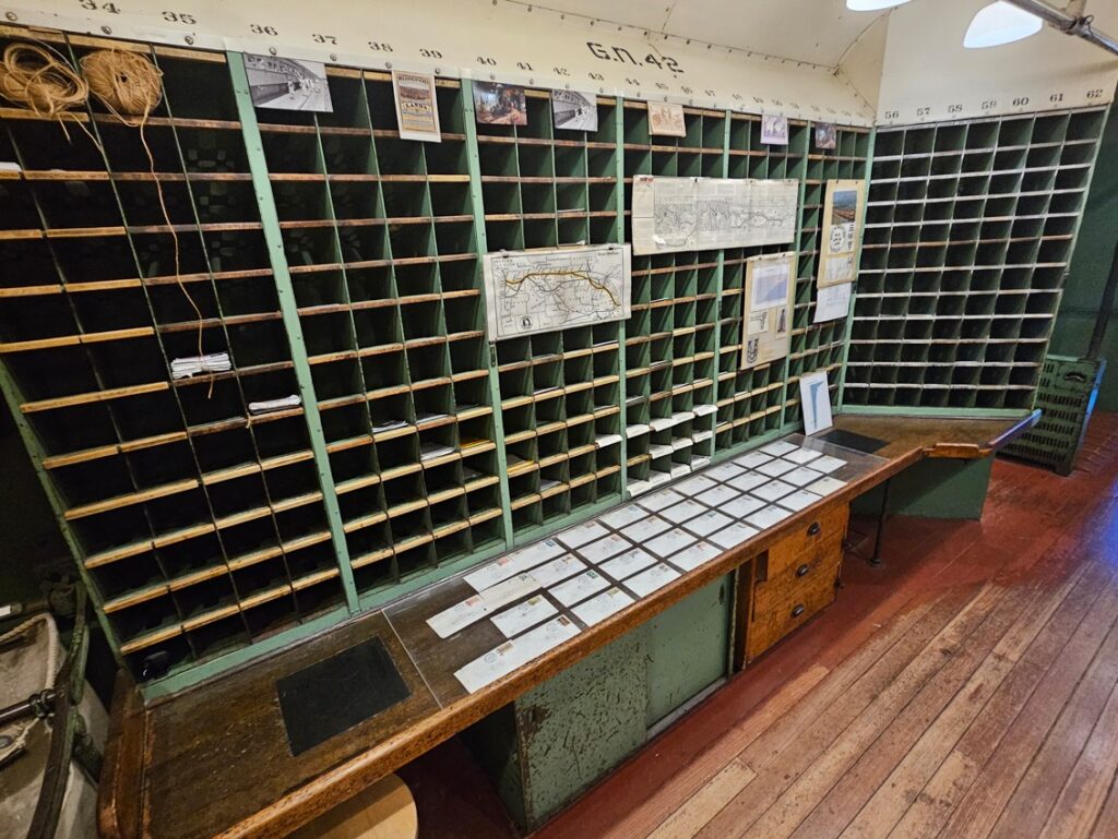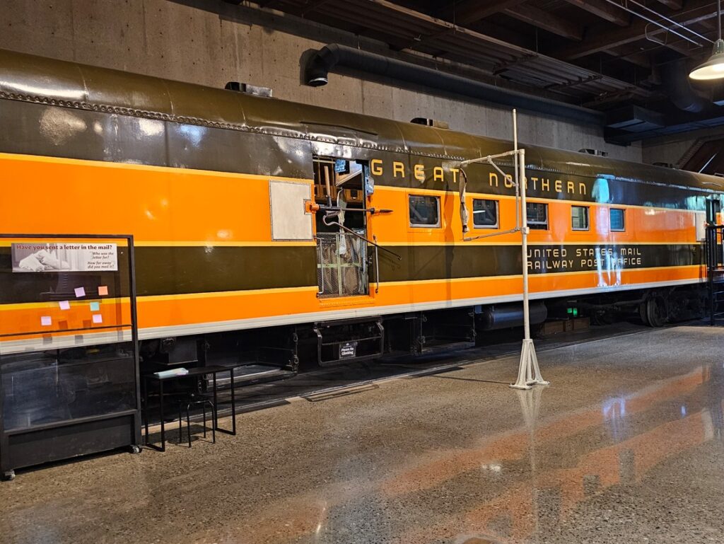 This is a pretty cool museum in Sacramento that exhibits railroad history in California. Virginia & Truckee Railroad Locomotive No. 13 “Empire” served as a freight engine for more than 40 years. Engine crews considered 13 an unlucky number so the company changed to 15.The Forgotten Railroad Workers Memorial Monument. Chinese artist Xuejun Yang created this monument in 2019, honoring the Chinese workers who played a heroic and important role building the Transcontinental Railroad. Between 1865 and 1869 Central Pacific Railroad employed more than 12,000 Chinese workers to build the western portion on the railroad. They cleared land, put down roadbed, shoveled snow, blasted tunnels through granite and laid track.Great Northern Railway Post Office Car No. 42 operated as a complete post office between Chicago IL and Tacoma WA. Inside the moving car, armed postal clerks sorted mail and the train moved along at up to 80 mph.Inside the mail car.My grandfather worked for a time in the 1940s and 1950s on a mail car between Washington DC and Jacksonville FL.Virginia & Truckee No. 18 “Dayton”.Atchison, Topeka & Santa Fe Dining Car No. 1474 “Cochiti” was built for Santa Fe’s first streamlined stainless steel train, the Los Angeles to Chicago Super Chief.Attentive waiters served meals on distinctive china. Railroad companies each had their own special designs.Fine dining on the rails!AT&SF railroad chins pattern.New York CentralComfortable seatingSleeping berthsProduce car.Baggage car (The people are real, not mannequins!)This scene interprets the building of the Transcontinental Railroad 1865-1869. A really well done display.Blasting through granite.Surveyor.Surveying and building equipment.A proud achievement.